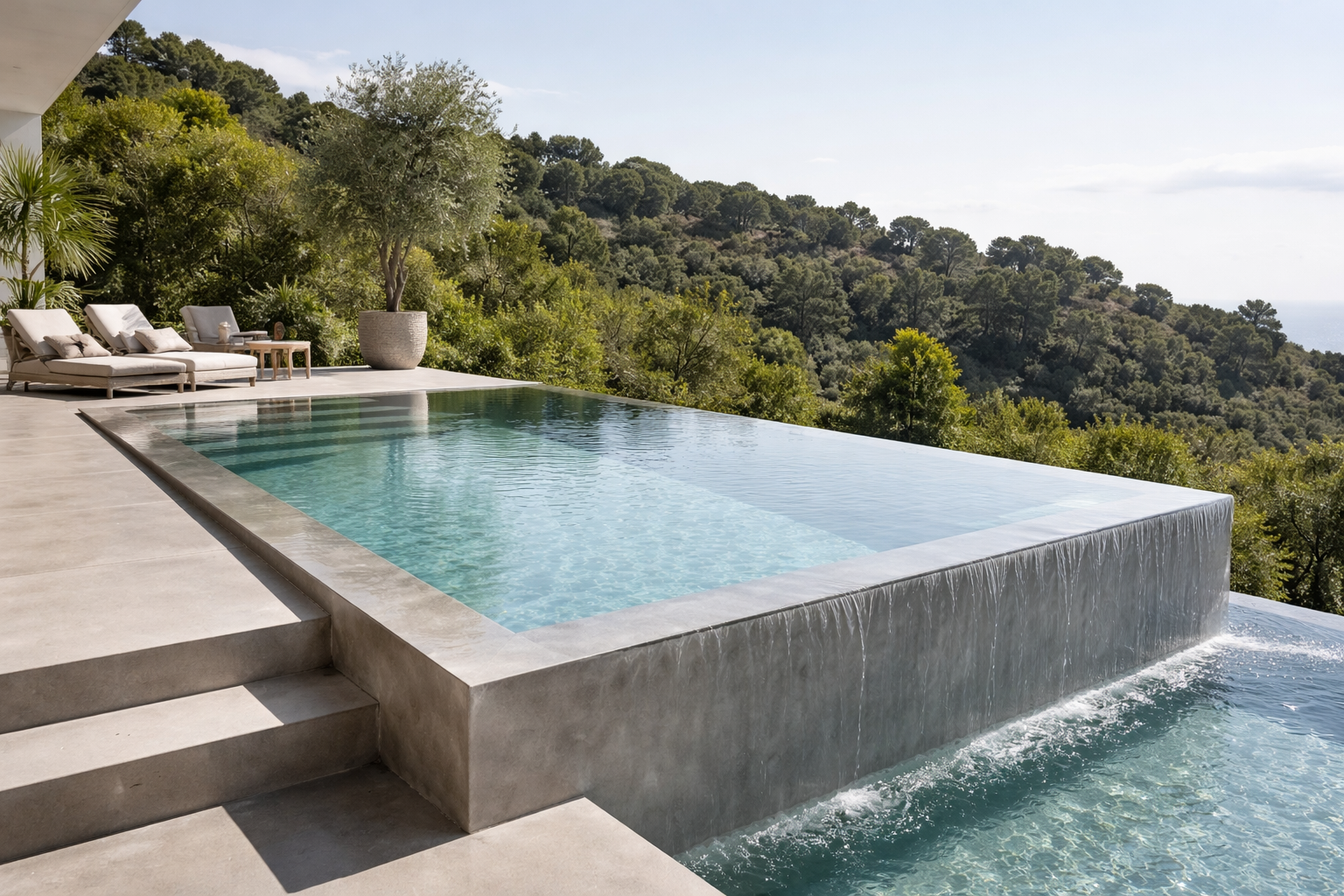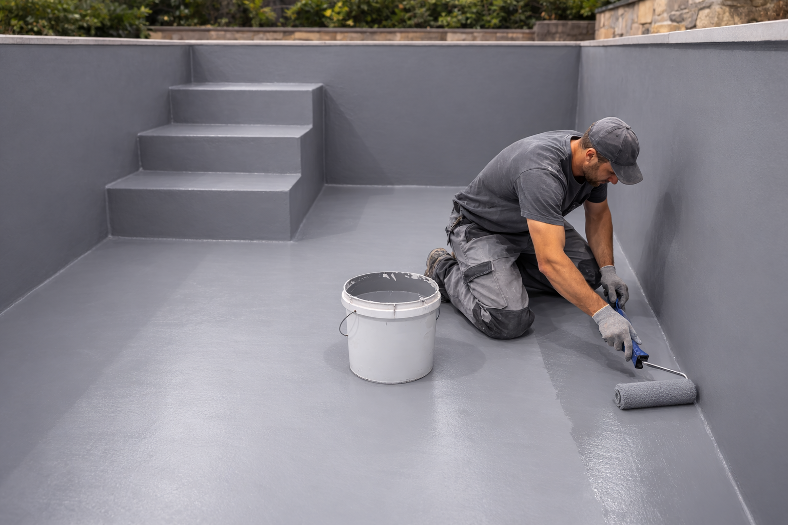 Микроцемент для бассейнов и резервуаров — это специальное тонкое цементно-полимерное покрытие, которым покрывают чашу бассейна, борта и зону вокруг воды. Оно создаёт монолитную, бесшовную поверхность, которая не пропускает воду и выдерживает постоянный контакт с влагой и химией бассейна. Это декоративное и водостойкое покрытие, которым можно сделать весь бассейн/резервуар как один цельный бетонный монолит без плитки и швов.